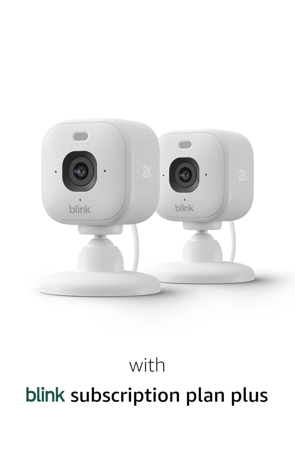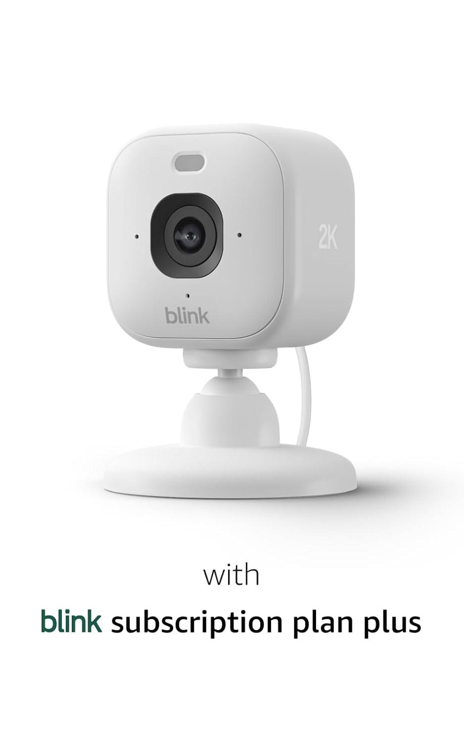 Includes one Blink Mini 2K+ camera, one-year Blink Subscription Plus Plan, one mounting kit including stand, one USB cable, and one power adapter.